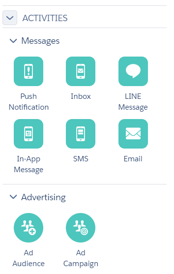 - Messages: includes the default channels managed in Marketing Cloud (email, SMS and push).