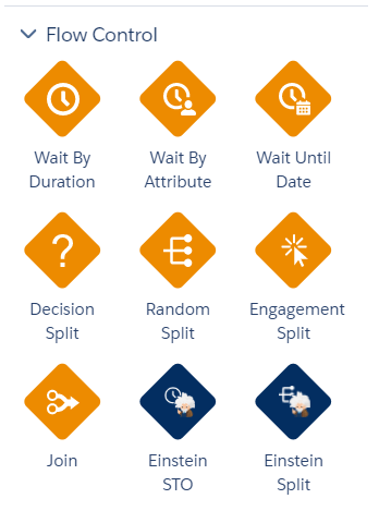 In orange, the flow control activities, that drive the customers within the journey through the different paths: