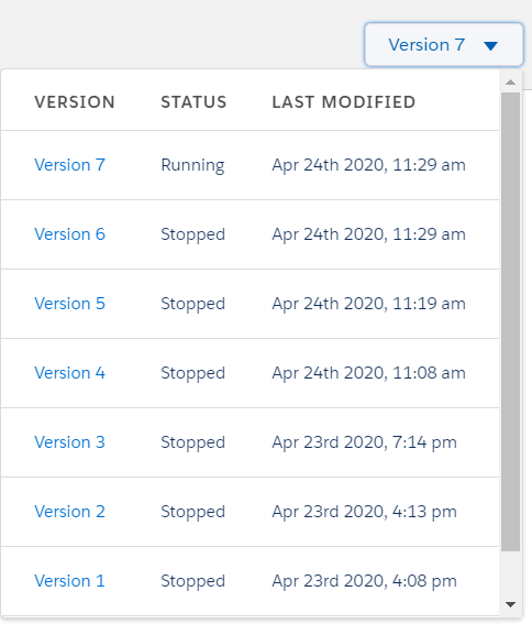 On this respective, when the new version is activated, it begins admitting new customers but, those who already entered the previous version, remain in the previous version. When all the customers of the old version have exited, the version becomes inactive.